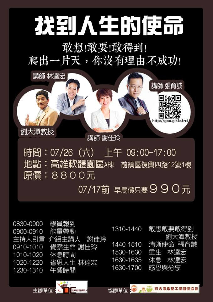 如果用一天的時間讓你找到你這輩子人生中最重要的使命,找到你真正有熱情而且可以活出自我人生願景的課程,你願意花一天的時間來找回自己並設定未來人生的道路嗎?
